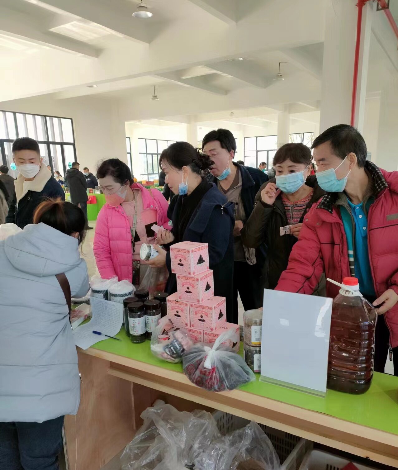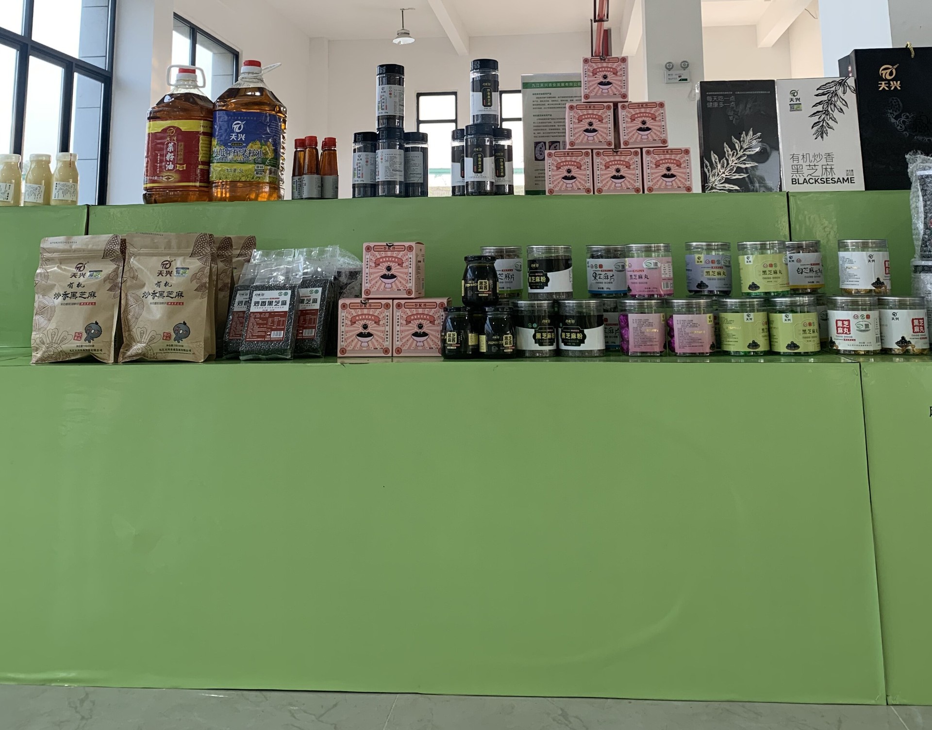 九江天兴农业发展有限公司踊跃参加,一大早8:00之前公司同事就来到螺丝岗乡村振兴馆布置好场地,等待人们的到来。在现场除了我们公司,还有瑞昌其他公司也来展示自己的农产品,像瑞昌市溢香农产品有限公司的板鸭、桃酥、鸭蛋等产品,赛湖的有机黄花菜和酒槽鱼等,彭蠡泽牌鄱阳湖稻米等。我司在这次农产品展示会上展示的有天兴黑芝麻、天兴炒香黑白芝麻、各种口味的天兴芝麻丸、天兴芝麻油和菜籽油、天兴小茶饼、谷配坊炒香黑芝麻、谷配坊芝麻叶、谷配坊黑芝麻酱等,还有最近天猫新上架的拥有最新包装的谷配坊蜂蜜黑芝麻丸。此次推出的芝麻产品丰富,种类多,可供大众任意挑选购买。